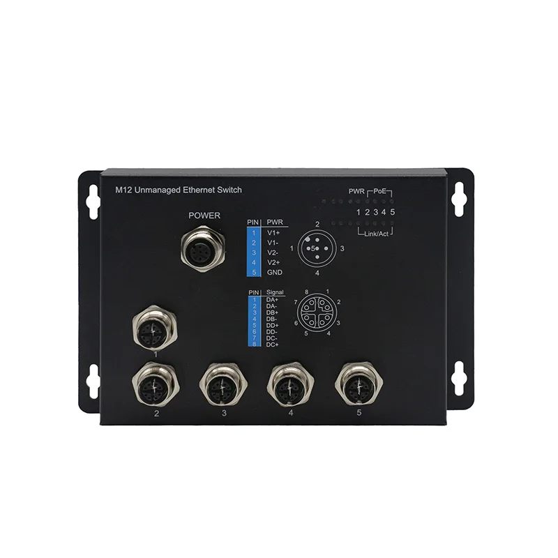Metal casing rugged unmanaged Industrial Switch, 8-Port M12 A-coded 10/100Mbps (4-pin), Power supply: DC12~52V (M12 A-coded 5-pin), work temperature:-40℃-75℃, PoE optional: 8 port PoE (DC48-57V).